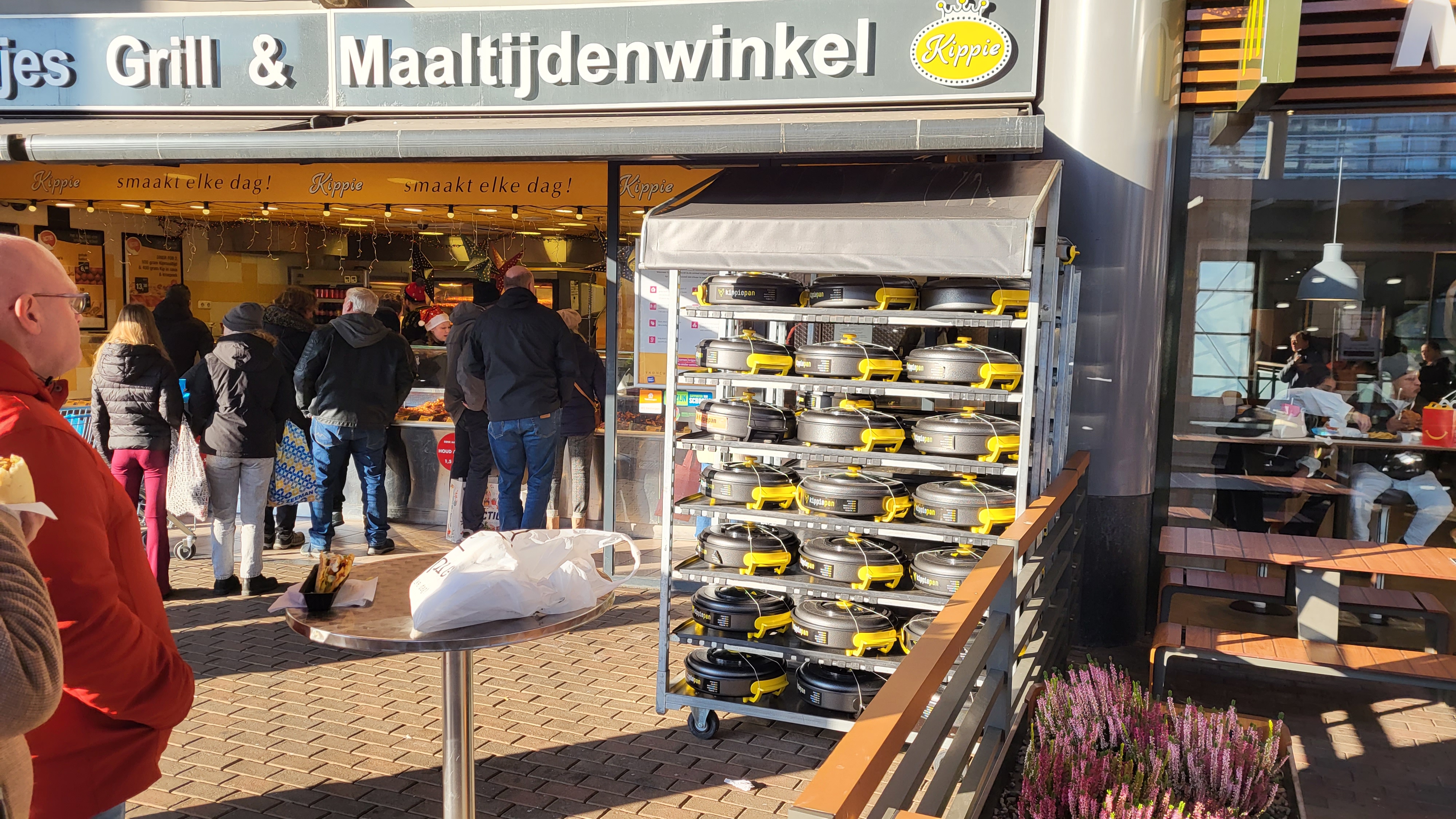 Ein weiteres gutes Beispiel für den dänischen Karrenals Präsentationsmittel haben wir in einem Kippie-Geschäft gefunden: ein Wagen mit (leeren) Kippie-Pfannen und einem Horti-Roof, einem der Dachsysteme aus unserem Sortiment, darauf. Der Wagen ist mit unseren robusten, hygienischen Kunststoffplatten ausgestattet. Diese Platten haben eine höhere Belastbarkeit, sind abwaschbar und durch die glatte Oberfläche haben Bakterien und Pilze keine Chance, sich einzunisten.