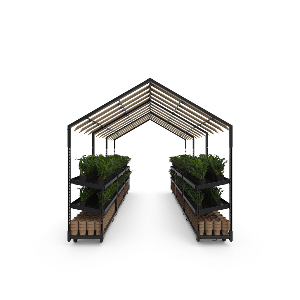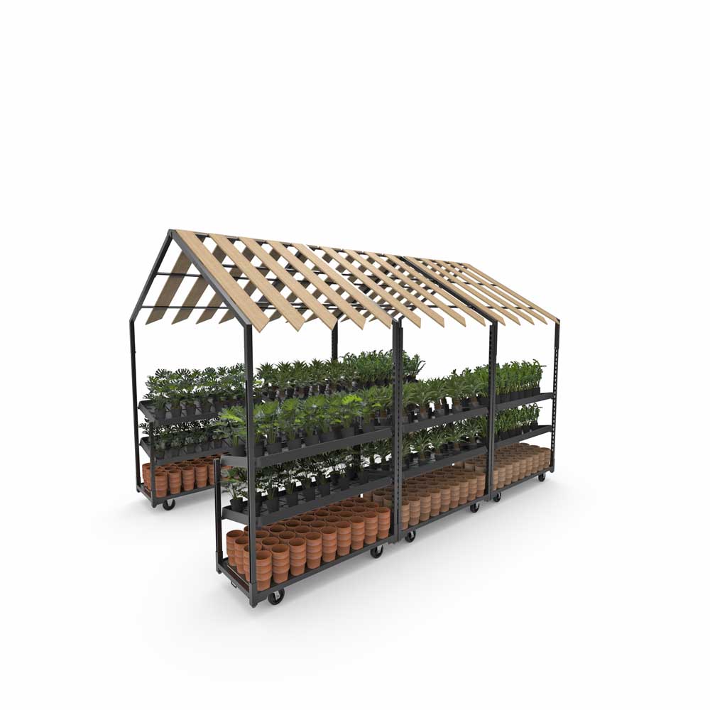 Das Gewächshausdach sorgt für ein offenes und luftiges Erscheinungsbild, wobei die Holzregale so platziert sind, dass genügend Tageslicht einfällt. Modular, Koppelbar, leicht zu bewegen.